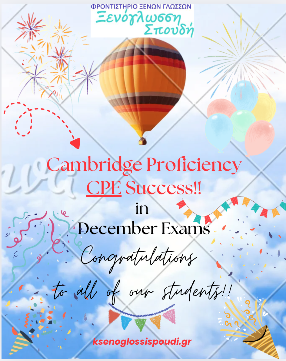 Συγχαρητήρια σε όλους τους μικρούς μας μαθητές που συμμετείχαν στις εξετάσεις YLE STARTERS- MOVERS- FLYERS του Πανεπιστημίου του Cambridge της Μεγάλης Βρετανίας και απέκτησαν πτυχίο γλωσσομάθειας με αποτελέσματα επιτυχίας 5/5 για τους συμμετέχοντες STARTERS και MOVERS και κατά μέσον όρο 4/5 για τους συμμετέχοντες FLYERS!!